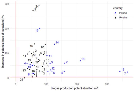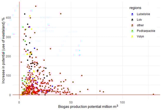 As in the case of the regions (NUTS 2), the same regularity could be observed in the powiats and raions consisting of the inability to significantly increase the biogas production by territorial units with the “basic” potential exceeding the average values. A good example visible on the right side of Figure 6 is the city of Warsaw, with the “basic” potential reaching 130 million m3 and the city of Kiev with a potential of over 85 million m3 (shown in Figure 5 as point number 25), which is because territorial division and functions usually do not have wasteland resources. This situation also appeared for all powiats, whose borders mainly enclose urban areas.