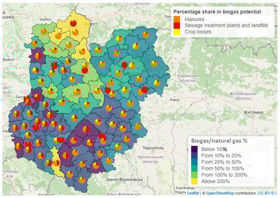 The more developed agricultural economy on the Polish side (using a larger percentage of land for cultivation) caused Polish powiats to show much fewer opportunities to increase the potential of biogas compared to Ukrainian raions with larger resources of wasteland. In addition, it is worth noting that the possibilities of increasing the potential based on the use of wasteland clearly decrease with the increase in the so-called “basic” potential built mainly on the basis of natural fertilizers, polonium losses as well as landfills and sewage treatment plants. Among the powiats shown in Figure 6, medium and large urban centers have the smallest potential to increase their potential, or the lack of such opportunities. Cities, due to the large number of people and thus considerable resources of municipal waste, sometimes have a large so-called “basic” potential on the regional scale, however, due to the small area and the lack of wasteland, they do not show any possibility of increasing it. The potential of cities is sometimes 100% built by municipal waste and biogas obtainable from sewage treatment plants (Figure 7). In the case of other powiats, natural fertilizers play a dominant role in building the “basic” potential of biogas, which is particularly clear in the Lviv, Volyn, and Lubelskie regions. In terms of spatial distribution, it is worth emphasizing that Polish powiats with a greater potential for biogas production in relation to the consumption of natural gas tended to group close to the border (Figure 7). On the other hand, the opposite tendency was visible for the Lviv region.