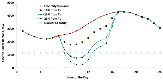 Figure 1 illustrates the duck curve with reference to the hourly demand during a summer day in the city of San Antonio, Texas (data from [16]). The upper curve represents the hourly power demand in the region. The noteworthy increase in electricity demand during the afternoon hours signifies the contribution of air conditioning to the summer demand. The next three curves pertain to stipulated annual contributions of PV cells to the total electric energy during a year. For example, “20% from PV” implies that PV cells (installed either in buildings or in solar farms) supply 20% of the annually generated electric energy. As all of the energy from PV cells is generated during the day, the effect of this type of electricity generation appears only during the daylight hours, and especially during the morning hours when the solar irradiance is strong, but the air conditioning demand does not fully materialize. The last (horizontal) line shows the contribution of the nuclear power plants, approximately 1100 MW for this city. It is observed in Figure 1 that, as the market penetration of PVs increases and more electric energy is generated by PV cells, the electric power demand from the non-solar units significantly decreases. When the contribution of the solar units reaches and exceeds 20% of the annually generated electricity, the duck curve drops below the nuclear generation capacity. Given that the current group of nuclear reactors in the USA (and several other countries) generate power at a constant level and do not follow the electricity demand fluctuations, this implies that the excess energy during the morning hours (the area between the lower part of the duck curve and the nuclear capacity line) must be either dissipated in the electricity grid or otherwise stored.