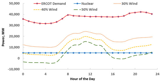 A curve that is analogous, but not of the same shape as the duck curve, is created when the wind market penetration increases. Figure 2 shows the hourly power demand in ERCOT—the grid that supplies power to most of Texas—during a day in the spring, when the demand is not high and the wind in the region is strong, especially in the early hours of the morning and after dusk, (data from [17,18]). The nuclear generating capacity in the region is approximately 4950 MW and is represented by the horizontal blue line. It is observed that the non-wind power demand drops below the nuclear capacity and even below zero for most of the 24 h period, when the renewable wind units generate 50% of the total annual electric energy. These dips are due to a combination of the higher wind energy during the nighttime and the lower demand during the early morning hours. They signify high wind power generation that cannot be absorbed by the demand. The excess power (the dip below the nuclear supply level) must either be stored or otherwise dissipated in the grid and wasted. The shape of the curves in Figure 2 also points to the fact that the demand from the non-RES power plants may have several minima and maxima during a 24 h period. Given the high variability and uncertainty in the wind-generated electricity, any type of planning to meet the power demand of the consumers without sufficient storage will be highly probabilistic and laden with significant uncertainty.