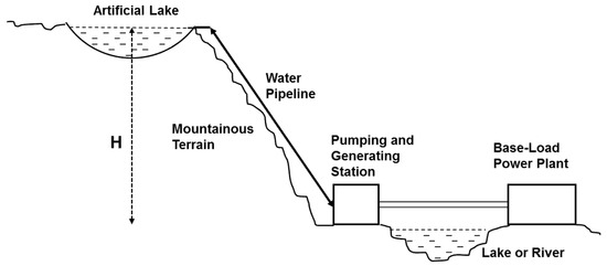 Figure 3 is a schematic diagram of a PHS. A base-load power plant (typically nuclear, in an era of decarbonization) provides the energy for the operation of the PHS. When the demand is low, the excess energy produced by the power plant is directed to a pumping station, with a motor-pump combined efficiency, denoted by ηP, that lifts and conveys water to a natural (if available at the desired elevation) or artificial lake at an elevation H [25,46]. The potential energy of the water is used for the generation of electric power when the demand exceeds the supply. During this operation, water is withdrawn from the lake and is conveyed in the same pipeline to a hydraulic turbine, with the turbine generator efficiency denoted by ηT, which produces the needed power [25]. For small-scale PHSs, it is possible to combine the pump and the hydraulic turbine in a single device—the pump-as-turbine system (PAT) that saves capital costs [47,48]. The types of turbines used for such systems are the Deriaz and Francis turbines. While this combination saves capital cost, it also results in decreased round-trip efficiencies.