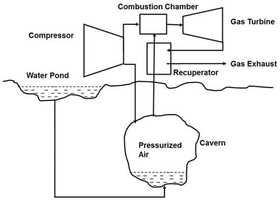 Energy in CAESs is stored in compressed air and the entire system operates in conjunction with a Brayton cycle power plant, as depicted in the schematic diagram of Figure 4. The diagram includes an optional water pond that maintains constant pressure in the system as the air is added and withdrawn. Under normal operating conditions, the compressor of the Brayton cycle is driven by the turbine and compresses air to moderate pressures (10–40 bar). The air is directed to the combustion chamber, where its temperature is increased (typically to 1700–2200 K) by burning some type of fossil fuel. The high-temperature gas is directed to the gas turbine, which generates electric power. At normal operation, the gas turbine supplies a high fraction of the power it generates (35–45%) to the compressor, thus generating only 55–65% of its rated power as electric power.