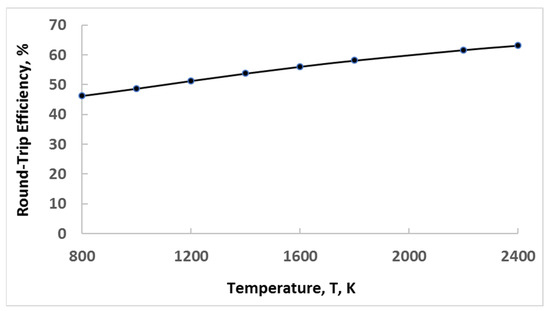 The combustion dependence of the generated power introduces another parameter in the calculations of the round trip of CAES, that of turbine inlet temperature. The round-trip efficiency of the CAES was calculated for the last case of storage in Table 3 (500 K and 80 bar), when the compressed air is fed to a natural gas combustor with 100% efficiency and the hotter combustion products drive a turbine generator system with 85% efficiency. The results are shown in Figure 5, where it is observed that the round-trip efficiency of the storage process increases significantly with the upper temperature of the system. However, it is also observed that the range of the round-trip efficiency is 46–63% for all the practical gas turbine inlet temperatures. Hence, the energy dissipation in CAESs is significant and may be close to half of the energy spent for the storage process.