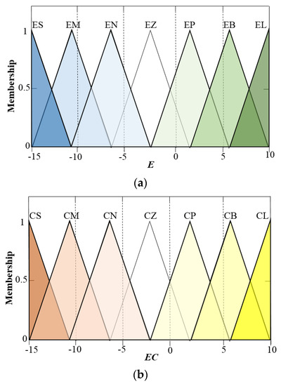 The deviation E between the expected velocity of the HFC vehicle and the velocity is used as the input variables as well as the deviation change rate EC. Due to factors such as signal lights, pedestrians, and higher vehicle density, the running conditions of the vehicles in urban are more complicated than the ones outside urban. Therefore, we analyze the actual test data under typical working conditions, such as the Urban Dynamometer Driving Schedule. According to the fuzzy control system design method, the domain of E is defined as [−15, 10], the corresponding fuzzy subset is [ES, EM, EN, EZ, EP, EB, EL]. The domain of EC is defined as [−14, 31], the corresponding fuzzy subset is [CS, CM, CN, CZ, CP, CB, CL]. The trim function is utilized to set the membership function for fuzzy processing. The fuzzy value distributions of E and EC are shown in Figure 1.
