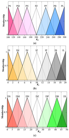 Take Kp, KI, KD as the output variables of the fuzzy controller and adjust the parameters by several trials. Then the domain of Kp is defined as [100, 300], and the corresponding fuzzy subset is [PS, PM, PN, PZ, PP, PB, PL]. The domain of KI is defined as [0, 20], and the corresponding fuzzy subset is [IS, IM, IN, IZ, IP, IB, IL]. The domain of KD is defined as [0, 50], and the corresponding fuzzy subset is [DS, DM, DN, DZ, DP, DB, DL]. Similarly, the trim function is utilized to set the membership function for fuzzy processing. The fuzzy value distributions of Kp, KI, KD are shown in Figure 2.