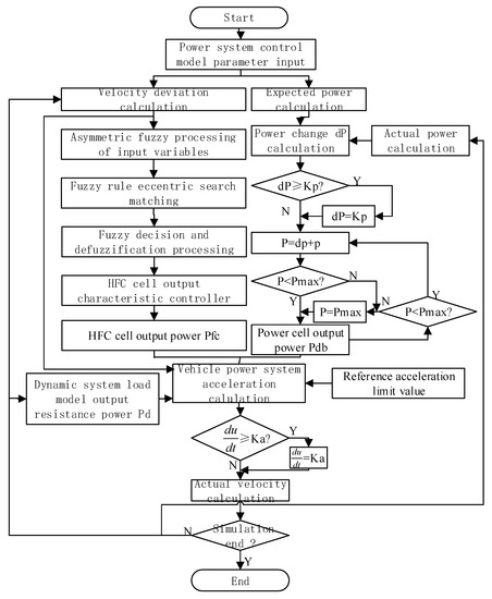 According to the proposed improved fuzzy PID control algorithm, the control process can be expressed as it is shown in Figure 6. The established power system control model is a concrete realization of the improved fuzzy PID system control method that adapts to the HFC power system proposed in this paper. It can be seen from the establishment process of the power system control model that the control algorithm proposed in this paper not only designs the acceleration brake module and the power distribution module, but also compares the fuzzy control variable universe based on the characteristics of the model built in this paper and the actual driving conditions of the vehicle. The design method has been improved asymmetrically. In addition, the design of fuzzy control rules has been eccentrically improved to achieve a better control effect.