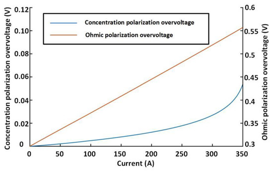 Concentration polarization overvoltage and ohmic polarization overvoltage change with current.