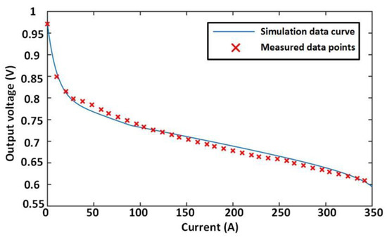 The above simulation curve illustrates that as the loading current increases, the electrochemical Nernst electromotive force gradually stabilizes after a slight decrease due to changes in the cell operating temperature and the effective partial pressure of the reactant gas at a low load. The activation polarization overvoltage increases rapidly when the current load is small. The value of the concentration polarization overvoltage increases rapidly when the current load is at a higher level. The ohmic polarization overvoltage has a close linear positive correlation with the load current. The test data and the simulation data are compared, and the results are shown in Figure 9. The error between the simulated data and the actual data is shown in Table 6.