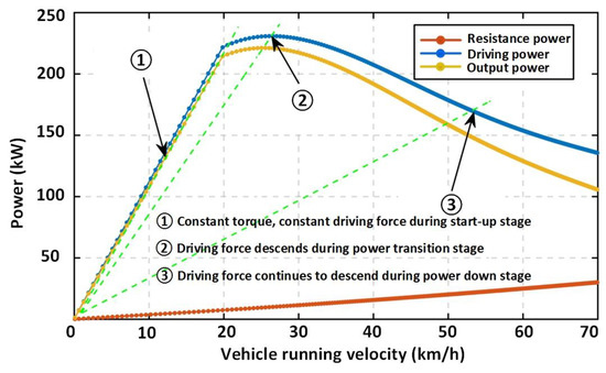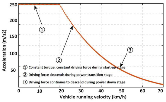 It can be seen from Figure 12 that the acceleration decreases slowly during the constant torque starting phase. It decreases significantly during the power transition phase and the power drop phase, which is consistent with the simulation analysis results of the acceleration resistance.