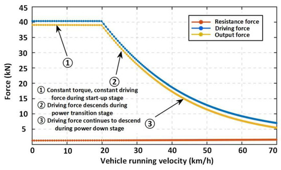 Through the slope of the line between each power curve and the origin (green dotted line) in Figure 10, the changing trend of each part of the force can be obtained. In the constant torque starting stage (0~19.72 km/h), the driving power of the power system has a linear relationship with the velocity, and the driving force should be a fixed value. In the power transition stage (19.72~27.06 km/h), the driving power is still increasing, but the slope of the connecting line between the driving power and the origin begins to decrease, so the driving force gradually decreases. In the power drop stage (above 27.06 km/h), the driving power gradually decreases, and the driving force continues to decrease. The driving resistance refers to the sum of all resistances except acceleration resistance. In this process, the driving resistance always increases slowly with the increase of velocity. The above results are verified by combining the driving force-resistance balance diagram obtained from the simulation of the dynamic load model of the dynamic system, as shown in Figure 11.