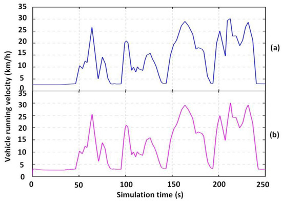 The velocity change curves of both actual working conditions (a) and the algorithm proposed in this paper (b).