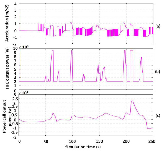 The comparison of the velocity curves in Figure 13 illustrates that the vehicle’s running velocity in the simulation results is in good agreement with the expected velocity, which proves that the improved fuzzy adaptive PID control algorithm proposed in this paper can meet the velocity control requirements of HFC vehicles under complex working conditions. Furthermore, the simulation results of the HFC vehicle acceleration, the HFC vehicle output power, and the power cell output power are shown in Figure 14.