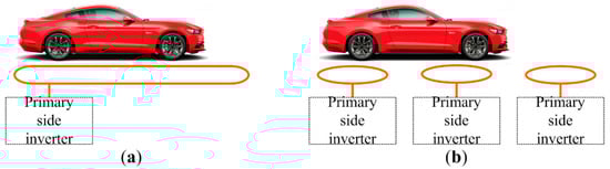 In the centralized power supply structure (Figure 1a), a large transmitting coil is installed on the road’s surface. The centralized scheme has higher losses, high installation, and higher maintenance costs than the segmented scheme [4]. In comparison with the receiver coil (Rx), larger sizes of the transmitter (Tx) coils cause a low coupling coefficient rating, leading to decreased efficiencies [3]. Segment-based solutions are more efficient because segments can be individually controlled [3]. The system structure has an array of transmission coils (Figure 1b). One example of such a project is the Versailles–Satory Site [5]—EV with a charging capacity of up to 20 kW.