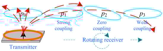 Rotating coil systems are widely used in industry [16,17,18,19,20,21,22,23]. For example, in [23], a novel approach of transmission efficiency valley of death (TEVD) was proposed for the magnetic-resonance-coupled WPT system to reduce lateral misalignments. In this system, the receiving flat spiral coil rotates at a certain angle depending on the distance to the receiving coil so that the magnetic flux always passes the receiver in one direction and is as large as possible through the area of the coil (Figure 2). This increases the efficiency and the operating range of distances. However, [23] showed only one transmitting and receiving coil and the authors used it as a system of static charging with a locking receiving coil at certain distances.