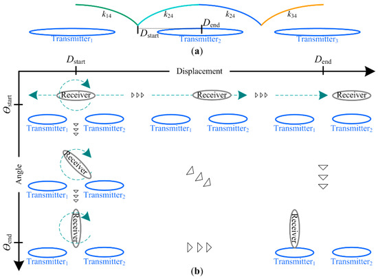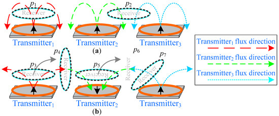 Receiver coil movement trajectories and expected transmitter flux directions: (a) conventional solution and (b) proposed solution.