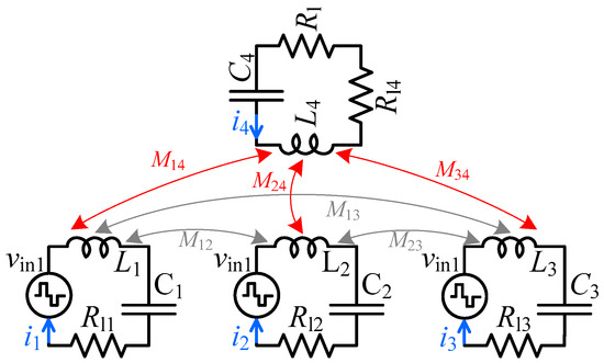 Coupled coils were represented using a model with mutual inductance. In comparison to the solution with self and leakage inductances, this model could simplify the system order. There were six mutual inductances. M14, M24 and M34 represent coupling between the transmitters and the receiver, while M12, M23 and M13 represent coupling between the transmitters and, in some cases, the large distance between the transmitters could be neglected.