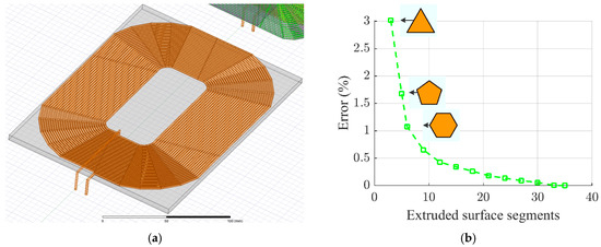 To estimate the coupling coefficients between the transmitting and the receiving coils, a 3D FEM simulation was performed in ANSYS MAXWELL software. The receiver and transmitter coils were generated using a developed script in the Python language, which extruded the hexagonal shape of the cross-section along the proposed coil shape. As shown in the simulation analysis (Figure 6b), the hexagonal shape was sufficient for precise measurements with an accuracy of ~1%. An increased amount of extruded surface segments increased the accuracy by only a limited amount, but the computational requirements were significantly increased. The estimated coil inductances are given in Table 2. There was a deviation in the self-inductance during movement, which was caused by the influence of the ferrite shields. According to the simulation results, the parameter deviation was less than 5% and, therefore, was neglected in the analysis.