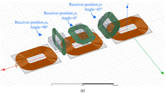 Figure 11a gives the simulation results. It can be seen that the maximum efficiency along the track remained the same and that the angle of the receiver coil had a strong influence on the value of the coupling coefficient.