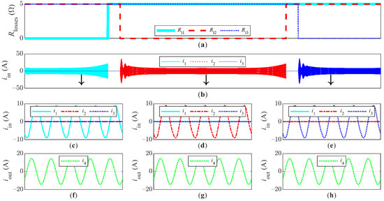 Simulation results of transmitter coil activation: (a) losses due to resistor Rl1, Rl2 and Rl3 values; (b) input currents i1, i2 and i3; (c) input currents i1, i2 and i3 for the first coil activated; (d) input currents i1, i2 and i3 for the second coil activated; (e) input currents i1, i2 and i3 for the third coil activated; (f) output current i4 for the first coil activated; (g) output current i4 for the second coil activated; (h) output current i4 for the third coil activated.
