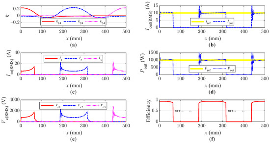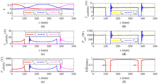 Third solution: (a) coupling coefficients k14, k24 and k34; (b) output current Iout(RMS); (c) input currents i1(RMS), i2(RMS) and i3(RMS); (d) output power Pout(RMS); (e) voltages on a primary side capacitor vc1(RMS), vc2(RMS) and vc3(RMS); (f) system efficiency.