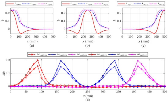 Modeling results under different conditions: (a) k14 coefficients, (b) k24 coefficients, (c) k34 coefficients and (d) increase in the coupling coefficient in comparison to the conventional solution.