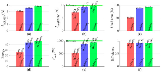 Comparison of three solutions: (a) input current Iin(RMS); (b) output current Iout(RMS); (c) used track area; (d) transmitted energy E; (e) transmitted power Pout(RMS); (f) system efficiency.