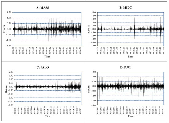 The daily logarithmic returns plots of these US electricity indices are presented in Figure 1. Table 2 indicates the descriptive statistics of returns and shows negative average returns in all series. The highest average loss (about 0.01%) is observed for PJM West, whereas the lowest average loss (around 0.15%) is noted for MIDC Hub. However, MIDC Hub has the highest maximum return of 439% in a single day, while Mass Hub has the highest loss of 110%. As shown in Figure 1, MIDC Hub is the most volatile index, followed by Mass Hub, PJM West, and Palo Verde. Skewness values are non-zero i.e., negative for all the sample series with the exception of Mass Hub. For kurtosis, all series demonstrate sharp peak characteristics, indicating the presence of fat tails. Hence, these electricity indices have significant deviations from normal distribution, implying the presence of multifractality, which could be created by non-Gaussian distribution such as fat tails [59].