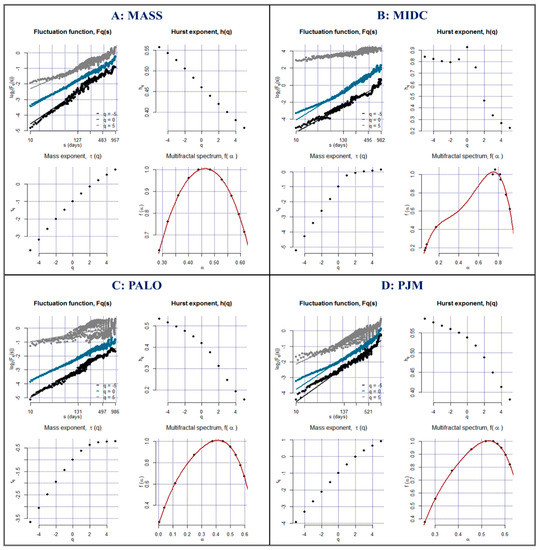 The MFDFA’s empirical results for the US electricity market indices are presented in this section. For all series, the log-log graphs of the fluctuation function vs. time scale , the slopes of generalized Hurst exponent, Renyi exponent , and the multifractal spectrum are presented in Figure 2. The fitted lines for all series are observed in the log-log graphs for the fluctuation functions and scales, which is picked up for . As for slopes of in Figure 2, the fitted lines that correspond to the generalized Hurst exponent evidently depend on . This declining pattern of and its dependency for scaling exponent imply the presence of multifractal structures. The plots of the Renyi exponent presented in Figure 2 are non-linear for all electricity indices. Finally, the presence of multifractality is proven by the multifractal spectrum , which is a single humped shape.