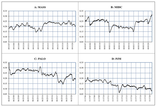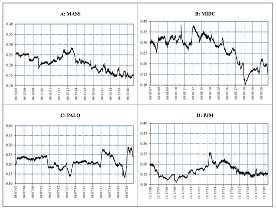 Figure 3 shows that the exponent lines never move up from 0.5 for all electricity indices throughout the time period. This indicates anti-persistent behavior (negative autocorrelation) during the whole sample. Figure 4 plots the results of the indices’ market inefficiency using the MLM measure. Looking at the graphs, we can see that all return series show rich multifractal degrees, but the highest is in Palo Verde. After the first quarter of 2014, MLM shows a downward trend for Mass Hub (New England) and PJM West, indicating an upward trend of market efficiency. According to the 2021 Regional Electricity Outlook report by ISO New England, a winter reliability program was designed in 2014 to keep the power grid reliable during periods of fuel insecurity. It happened because the region’s fuel delivery and energy security issues were highlighted by a brutal winter cold snap. For MIDC Hub, a significant improvement in efficiency is observed after the fourth quarter of 2012 with a maximum in 2018. The highest efficiency around the third quarter of 2018 could be due to the fact that electricity prices in the western US reached their highest levels since 2008. According to EIA [75], these high prices are the result of record high temperatures, which led to a relatively high demand for electricity. However, Palo Verde shows different behavior regarding market inefficiency, where the highest MLM values are found in 2017 and 2020, indicating the lowest efficiency. Electricity sales in the US declined by 80 billion kilowatt hours (kWh) in 2017, which is the largest drop since the economic recession in 2009. According to EIA [76], this major drop in sales is due to weather variations, which may have resulted in the highest inefficiency of Palo Verde in 2017. However, we found no significant impact of the recent COVID-19 pandemic on the degree of market efficiency for all electricity indices. On 11th March 2011, the Tohuku earthquake and tsunami struck Japan and sparked the Fukushima nuclear crisis. Woo et al. [77] document that the impact of that crisis is international and could have a significant effect on electricity markets, at least in the short term, as shutting down a nuclear plant reduces supply in the electricity market, which leads to a high market price. Figure 3 indicates a significant decrease in efficiency in electricity markets overall, especially Mass Hub and PJM West after 11 March 2011. Moreover, the overall electricity prices were high from 2012 to 2013, which were driven largely by an increase in spot natural gas prices [78]. However, due to regional supply and demand issues, the percentage increases in electricity prices were higher in MIDC and Mass Hub. MIDC is often among the least expensive in the regions because of the regional concentration of hydroelectric generation. According to EIA, the spring in MIDC region in 2013 was drier than the prior two springs, which kept prices higher. This could be attributed to the significant decrease in the inefficiency of MIDC from 2012 to 2013, as depicted in Figure 3. The cold weather put a strain on the already stressed natural gas pipeline infrastructure in New England. This resulted in electricity prices spikes in 2013, which might be the reason for the inefficiency spikes of Mass Hub during this period.