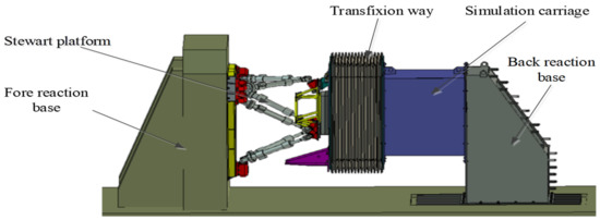 The Stewart parallel robot was usually installed on rigid bases parallel to the ground to accurately reproduce the actual motion conditions of ships, aircraft, and weapon systems [10,11], and it has been very successful in its structural analysis and optimization, and in its control strategy research, etc. In the comprehensive test of the train end relationship, the parallel robot was installed on the reaction bases perpendicular to the ground. As the heights of the loading test points of the train end relationship components were generally not less than 2.5 m, the stiffness of the reaction bases for the parallel robot was reduced, and the reaction bases became flexible bases. The flexible bases led to a decrease in the kinematic and dynamic performance of the parallel motion robot, resulting in an increase in motion error, a reduction in bandwidth, and mechanism resonance. Aiming at addressing the flexibility of the parallel robot, Amir Rezaei studied the stiffness of a 3-PSP parallel mechanism with a flexible moving platform, and proposed two stiffness-models and stiffness-analysis methods thereof based on the principle of the virtual work and the Karnife’s theorem [12]. Mahdi Sharifnia and Alireza Akbarzadeh provided analytical solutions to the dynamics and vibration characteristics of a 3-PSP parallel mechanism with a flexible moving platform [13]. Gengxiang Wang analyzed the influence of a flexible platform and a spherical joint clearance of a 4-SPSCU parallel mechanism on the dynamic performance, and he believed that the flexibility of the platform had little influence on the dynamic performance, and that the platform absorbed the energy generated by the impact of the spherical joint clearance [14]. Wei Wei simplified flexible bases into single-degree-of-freedom masses, springs, and damping models, and studied the influence of the flexible bases on the performance of a parallel mechanism system and the control strategy [15]. In summary, concerns have largely been focused on the influence of the flexibility of the platform and the flexibility of the driving mechanism on system characteristics [16,17,18,19,20,21].