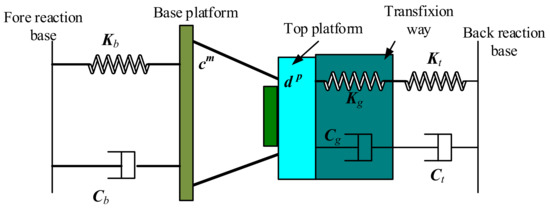 A physical model of the comprehensive test system for the train end relationship can be described in Figure 2. Kb and Cb represented the six-dimensional stiffness and damping of the fore reaction base, respectively; cm represented a matrix composed of lower hinge point coordinates of the Stewart platform; dp represented a matrix composed of upper hinge point coordinates of the Stewart platform; Kg and Cg represented the six-dimensional stiffness and damping of the transfixion way of the train, respectively, and Kt and Ct represented the six-dimensional stiffness and damping of the back reaction base, respectively.