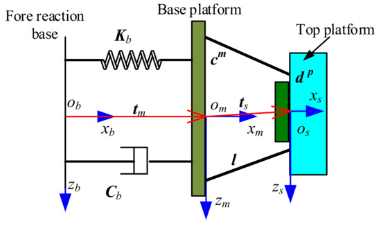 In order to describe the motion of the test platform in the physical space, three coordinate systems, as shown in Figure 3, were established. A platform-conjoined coordinate system {s} os-xsyszs was established at the center position of the upper hinge to describe the position and posture change of the upper platform relative to the base platform. A conjoined coordinate system {m} om-xmymzm was established at the center of the lower hinge point to describe the deformation caused by the flexibility of the base. An inertial coordinate system {b} ob-xbybzb was also located at the center of the lower hinge point and in the same direction as the conjoined coordinate system {m}.