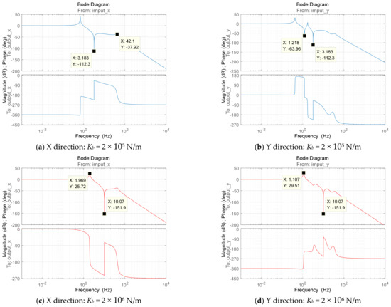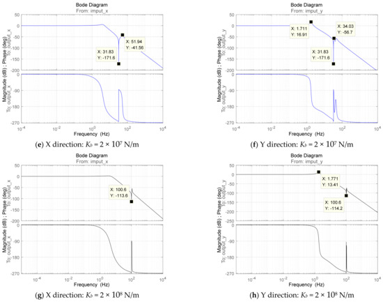 When the mass of the back reaction base was 500 kg and the stiffness variation was set to 2 × 105 N/m, 2 × 106 N/m, 2e7 N/m and 2 × 108 N/m, respectively, the corresponding natural frequency ranges of the base were 3.18, 10.06, 31.8 and 100 Hz, respectively. In this paper, only X and Y degrees of freedom were used to simulate the frequency characteristics, so as to illustrate the influence of the flexible base on the frequency characteristics of the parallel robot. The results were shown in Figure 6. Simulation results of frequency characteristics along X and Y degrees of freedom with different reaction base stiffnesses were shown in Figure 6. For Figure 6a,b, the stiffness of the reaction base was set as 2 × 105 N/m. For Figure 6c,d, the stiffness was 2 × 106 N/m. For Figure 6e,f, the stiffness was 2 × 107 N/m. For Figure 6g,h, the stiffness was 2 × 108 N/m.