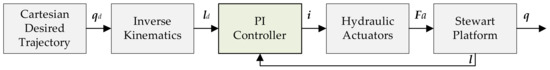 To verify the effectiveness of our analysis, we conducted experiments using a test system for the train end relationship, as shown in Figure 1. The detailed technical parameters are shown in Table 1. The pressure of the oil source is 21 MPa. The servo-controller is managed on an industrial personal computer running a hard real-time operating system, and the sample time of the controller is set as 1 ms. A PI controller as shown in Figure 7 is adopted. For a Cartesian desired trajectory qd, length of each actuator ld is calculated with Equation (4), and then the PI controller adjusts the drive command depending on ld and the actual length l of each actuator. Detailed design method and stability analysis of the controller can be found in our previous work [23,24,25]. Parameters of the controller were well tuned, with a trial-and-error method based on the response of the parallel robot in the time domain before experiments.