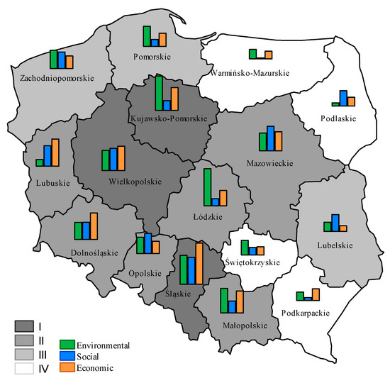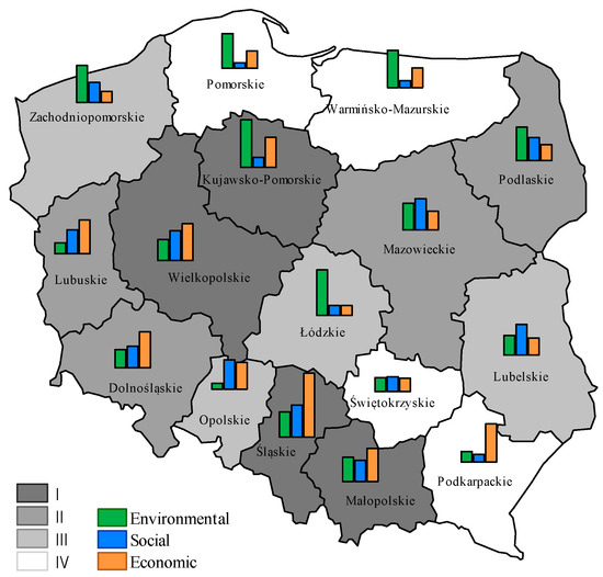 Diversification of sustainable transport development in particular voivodeships according to the classical measure. Note: the background of the voivodeships—the integrated order (total measure), the height of the histogram—denotes the values of the synthetic measures for particular orders i.e., environmental, social, economic. Source: own studies.
