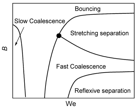Collision outcomes depend heavily on the Weber number, the distance between the droplets’ centers of mass, the surface tension and viscosity of the liquid, as well as the ambient pressure [5,6]. With this in mind, many scientists conclude that the research findings on droplet collisions can be conveniently generalized in the form of interaction regime maps in the B(We) coordinates (Figure 1) and We(Oh) coordinates [7,18]. Such maps determine the conditions, under which each collision outcome occurs. Thus, it is possible to choose the size, velocity, liquid properties, and impact angles of droplets so that their interaction led to their enlargement or atomization, depending on the required droplet size.