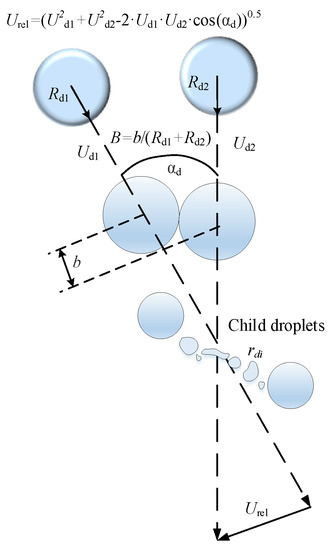 Several interaction parameters are generally used to describe droplet collisions [5,6] (Figure 3). The Weber number characterizes the correlation between inertia and surface tension. The Ohnesorge number accounts for the correlation of viscosity and surface tension. The parameter B describes the angular and linear droplet interactions. The parameter b characterizes the distance between the droplets’ centers of mass. The impact angle αd is measured from the line connecting the centers of mass of colliding droplets. Other interaction parameters include the relative droplet interaction velocity Urel and the size ratio of colliding droplets ∆. In addition, when analyzing the efficiency of droplet atomization, it is sensible [9,11,12] to use the primary droplet to secondary droplet size ratio or the surface area ratio S1/S0 after and before the collision. The initial droplet surface area is derived from the sizes of the colliding droplets Rd1 and Rd2: S0 = 4·π·(Rd12 + Rd22). The surface area of secondary fragments is calculated by knowing their size and number: S1 = 4·π·∑N·rdi2. Pavlenko et al. [23] expanded the above formula to factor in the probabilistic nature of the interfacial surface formation. They presented the following expression to determine the contact areas [23]: S = α⸱N1/3⸱V02/3, where V0 is the total volume of the dispersed phase and N is the number of spherical particles in the system. According to the authors, the total interfacial area depends on the volume of a medium and on the concentration of the dispersed phase. This parameter does not depend on particle size, but only on the law of their distribution, which is determined by the contact area ratio α. This approach is feasible for droplets colliding in a mist (within statistical approach described in the Introduction) rather than for binary droplet collisions.