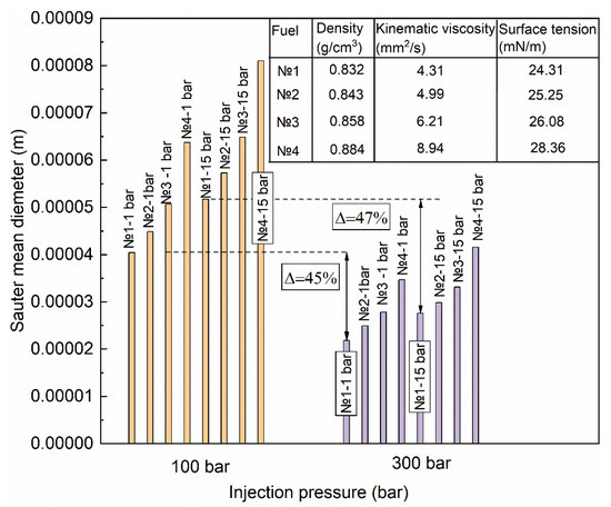 The impact of injection pressure of bio-diesel on its spraying characteristics was studied by Ghahremani et al. in Ref. [48]. The authors established that even a slight increase in the injection pressure or percentage of diesel fuel in a blend may significantly increase the jet angle and hence the spraying area. At the same time, one of the key ways to improve spraying efficiency is by increasing the difference between the injection pressure and the ambient pressure. Spraying characteristics can also be maintained by a simultaneous increase in the Ohnesorge number and decrease in the Reynolds number. Spraying can be characterized using the Sauter mean diameter [48]. Sauter diameter is the diameter of a droplet that has the same volume/surface area ratio as the entire array of droplets in a jet. The Sauter mean diameter calculated by Ghahremani et al. [48] with varying ambient pressure and injection pressure is given in Figure 4 for various types of fuel. Figure 4 shows that an increase in the injection pressure and ambient pressure improves the fuel jet spraying efficiency.