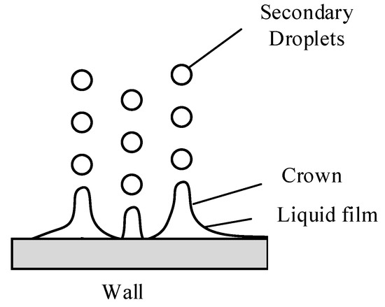 Droplet disruption after colliding with a solid surface is implemented in a wide range of industrial applications (fuel injection into combustion chambers, desalination, cooling, heat transfer in evaporators, water droplets hitting turbine blades, etc.). Research in this field focuses mainly on droplet interaction with a solid surface and with a surface covered by a liquid film. Today, an extensive body of experimental research findings has been accumulated on the effect of surface properties (roughness, hydrophilic and hydrophobic behavior, heating, and slope) on droplet collision dynamics. Review papers [60,61] made a significant contribution to the research into collisions of liquid droplets with surfaces. Liang and Mudawar [60] focused on high-velocity droplet impingement on a solid surface, spreading over it and forming a liquid film, as well as a crown with small secondary droplets shattering from the crown’s rim. The mechanism of this interaction is shown in Figure 5. The main factors affecting the droplet impact dynamics are generalized and distinguished [60]: droplet size (diameter), impact velocity, temperature and liquid properties (viscosity, density, and surface tension), and the surrounding gas properties (pressure, temperature, density, etc.). Liang and Mudawar outline the mechanisms for determining the characteristics of a liquid film with the specified roughness range of the wall and impact characteristics [60]. They also describe the crown formation dynamics with the specified Weber numbers, film thickness, diameter, and height, as well as droplet velocities, at which the crown is formed. It is shown that with Lnd < h * < 3 Rnd0.16 (where h * is the non-dimensional film thickness, Rnd denotes the non-dimensional wall roughness parameter, and Lnd refers to the non-dimensional length scale of wall roughness), the Impact depends on wall features. In the range of 3 Rnd0.16 < h * < 1.5, the liquid film regime occurs, and the Impact is weakly dependent on wall features. For the shallow pool regime, the range of these parameters is 1.5 < h * < 4: In this case, the Impact depends on film thickness but is independent of wall features. In the deep pool regime (h * > 4), the Impact is independent of film thickness.