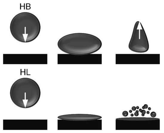 Droplet impingement on a surface: HB stands for hydrophobic surface; HL is hydrophilic surface.