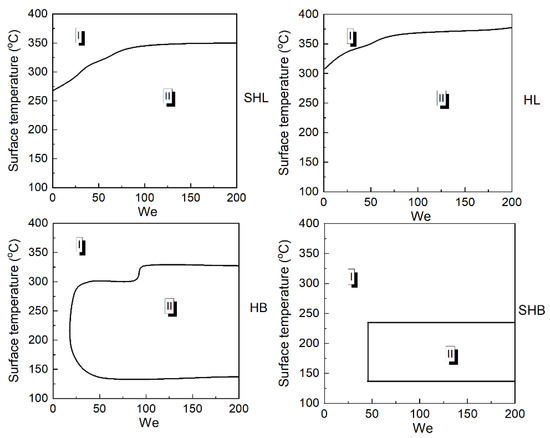 Wall impact regime map plotted using the data from [64]. I—secondary fragments are not formed; II—secondary droplets are formed. HL is hydrophilic surface; SHB denotes superhydrophobic surface; HB stands for hydrophobic surface.