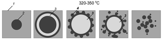 Experimental studies presented in Refs. [92,93] distinguished the following stages of heterogeneous droplet vaporization: evaporation from its free surface, bubble boiling at the internal interfaces, growth of bubbles and droplet enlargement with a decrease in the liquid film thickness around the inclusion, and explosive breakup (separation of a group of fragments with vapor and air bubbles in them). The authors established that adding <0.05-mm nontransparent carbonaceous inclusions (with a mass fraction under 2%) to water droplets contributes to a 40–50% reduction in droplet lifetimes compared with droplets containing only one nontransparent solid inclusion in the case of evaporation from an external surface. They also established the impact of a vapor layer forming around droplets and serving as an extra thermal insulation due to low thermal conductivity on the intensity of droplet evaporation. When a water droplet with a solid inclusion is heated in the air at over 1000 K, the evaporation surface area may increase by 3–15 times relative to the original droplet surface area due to intense liquid vaporization with an explosive breakup into small droplets [92,93].