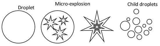 The micro-explosive breakup of droplets of liquids, slurries, and emulsions enables a several-fold increase in their evaporation surface area (Figure 9). This effect reduces the energy and time costs of fuel heating, evaporation, and ignition. It also decreases the anthropogenic emissions and provides more complete fuel combustion. The present-day systems of thermal and flame water treatment, as well as other principally different systems, unfortunately cannot provide high performance [87,88]. This is because the liquid to be treated needs to be fed to the thermal treatment chamber repeatedly. Impurities cannot evaporate or burn out completely during just one cycle in the heating chamber. Therefore, the energy consumption of these systems increases and so does the duration of the corresponding processes. In thermal liquid treatment and fuel technologies, this problem can be solved by droplet breakup into smaller fragments with a typical size of several dozens to several hundreds of microns. However, as the experiments [89] show, droplets this small moving at low velocities may stick to the walls of the combustion chamber walls or they may be entrained by high-velocity hot flue gases or incoming air flow and blown away from the thermal treatment chamber. Thus, preliminary droplet breakup before supplying them to heating chambers may result in technological limitations and complications. In this case, it is practical to start droplet disintegration in thermal treatment or combustion chambers in the process of heating. Researchers from all over the world endeavor to develop the corresponding technologies. The most effective ones in terms of stability as well as the required energy and time t involve explosive droplet boiling and breakup to form a fuel spray.