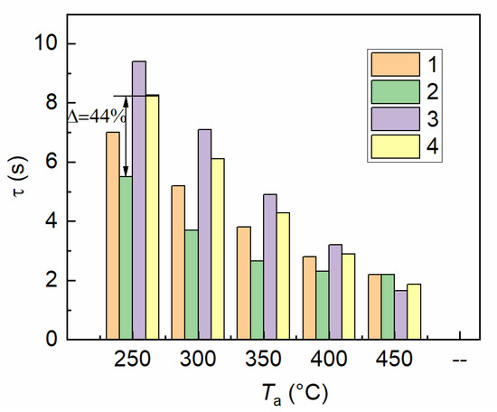 According to the preliminary analysis [103,104], the duration of two-component droplet heating and breakup as well as the size and number of resulting droplets largely depend on the concentration of components and the heat flux supplied to the droplet surface. With emulsion droplets, it is necessary to add such important factors as [103,104]: size of discontinuous phase droplets (water droplets in a combustible liquid, for instance, diesel), size of emulsion droplets, water content in the emulsion, as well as the concentration and type of stabilizer. To investigate the impact of the most important factors from the list above, experiments were carried out [103,104] with varying temperature in the muffle furnace, air flow temperature and velocity, as well as the concentration and type of the liquid combustible component. It was shown [103,104] that droplet lifetimes before swelling and micro-explosion decrease nonlinearly with an increase in the ambient temperature (Figure 10). This was linked to the non-linear (exponential) dependence of the evaporation rates of combustible and non-combustible liquid components on temperature [103,104]. Here, the more large-scale the changes in these velocities with the rising temperature and the lower the boiling, ignition, and flash temperatures of combustible components, the more significant the changes in the heating times until explosive breakup (τ) (in particular, Figure 10 shows a 44% difference between the parameter τ for the emulsion containing 5% of petroleum differs and that of the emulsion containing 5% of transformer oil). In some cases, as noted in Refs. [103,104], droplet puffing was difficult to record due to considerable surface transformations of droplets moving towards the channel with heated air as well as due to droplets breaking away from the holder. Therefore, the curves are not obtained for all the compositions in the temperature range of 250 to 550 °C.