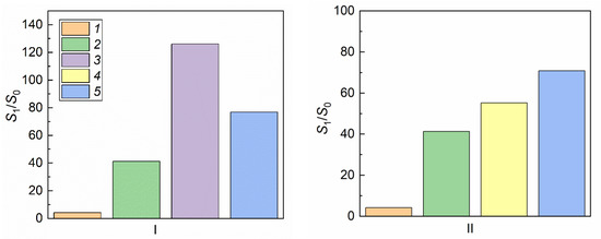Maximum surface area ratio of an emulsion containing 90 vol% of diesel and 10 vol% of water for combining most effective schemes (I–II), described in [105]: 1—droplet-droplet collisions; 2—exposure to air flow; 3—collision with a heated solid surface; 4—collision with a cold wall; 5—micro-explosive breakup.