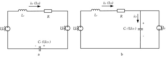 The schemes of Figure 1 contain the same elements: resonant capacitor Cr, resonant inductance Lr and equivalent resistance R, which reflects the presence of active resistances in the circuit elements, and IL0 and UC0 are the initial conditions of the state variables, the current through the resonant inductance and voltage on the resonant capacitor. The considered series resonant circuits are described by the following differential equation, regarding the capacitor voltage [1,3,19]:
