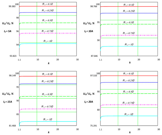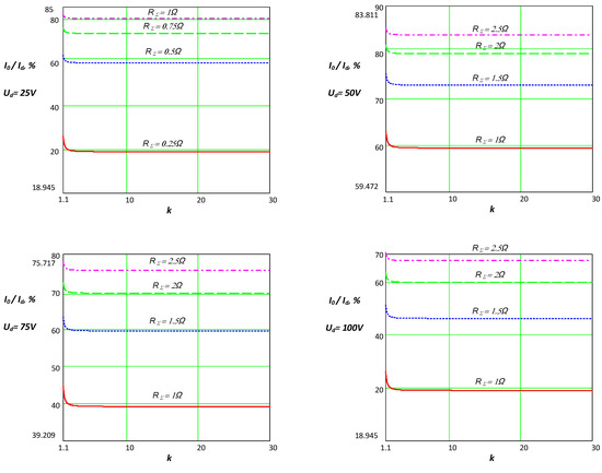 Based on the assessment of the loads of the building elements, their active resistances, which participate in RΣ, are determined. Figure 5 shows the dependence (Equation (16)) as a percentage of the value of the input current for different values of the supply voltage (respectively the power to be converted) and when the coefficient k and RΣ change. These characteristics are used to initially determine the output current and to quickly check whether the setpoint parameters can be achieved without the need for coordination.