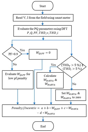 This tariff scheme calculates penalties or incentives based on domestic consumers’ reactive and harmonic energy profiles. This cost would be additional to their active energy cost and would be accumulated for short intervals of 10 min (settling window). The flowchart shown in Figure 1 illustrates the computation of the total penalty/incentive for a consumer. The first term, ‘a’, represents the fixed cost component of the tariff, which accounts for the costs related to the smart meter upgradation and operational and maintenance charges of ancillary services. The second term represents a penalty for violating power factor limits of 0.9. This limit is chosen as per the IEEE recommendations []. Here, ‘b’ is a penalty price for low PF ($/kVARh), and WQLPF is the reactive energy consumption at low PF (kVARh). The third term is the penalty to the consumer according to their harmonic pollution, where ‘c’ is the harmonic injection price ($/kVAh) and WHckVA is the nonfundamental or harmonic apparent energy (kVAh) injected by the consumer. The fourth and the last term is an incentive to the consumer due to grid harmonic distortion, where ‘d’ is the harmonic incentive price ($/kVAh) and WHukVA is the nonfundamental or harmonic apparent energy (kVAh) absorbed by the consumer due to the grid distortion. The index THD is chosen to verify the harmonic limit violation, and if violated, the penalty is based on the harmonic apparent energy. The THD of voltage and current are set to 5% in this work. However, these limits can be adjusted according to the recommendations of network operators and regulatory commissions. The value of d is chosen to be equal to the penalty price coefficient c. Thus, the consumer is penalized for the harmonic injection and given a compensation for distortion because of the grid voltage at the same price. This penalty/incentive tariff promotes good behavior from the consumer and utility and helps improve good practices for PQ regulation. The price coefficients b, c, and d are determined based on the techno-economic consequences of the consumer’s reactive power and harmonic injection to the utility [].