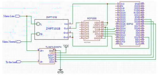 To implement the proposed PQ-based tariff, a hardware setup of the smart PQ meter has been developed. The experimental setup of the meter and its PCB schematic are shown in Figure 2 and Figure 3, respectively. This meter consists of mainly three sections: measurement, processing, and data relaying. The measurement section comprises voltage and current sensors along with an external ADC MCP3008. In most common circuits, a resistive voltage divider is used to step down and sample the line voltage, but that suffers from power line and stray noise issues. To overcome this, galvanic isolation is necessary between the power and measurement circuitry. Therefore, ZMPT101B is chosen for the voltage sensing because of its onboard potential transformer. This sensor belongs to the high-accuracy measurement class of 0.2, has a 1% linearity, and gives analog voltage output proportional to the line voltage applied across its input terminals. The ADC MCP3008 samples this output voltage, and it streams the digital readings to the dataplane processing unit (DPU) by SPI protocol. The current is measured by an integrated differential Hall-effect (Infineon TLI4970) sensor, which can measure up to 50 A of peak value with a factory calibrated 1% precision range. This current sensor chip consists of an integrated differential Hall sensor on board along with integrated stress and temperature measurement sensors to compensate the readings for chip stress and temperature variations. It utilizes onboard DSP to process and filter the measurements directly. This DSP can be configured to design a filter of the user’s choice to output the processed signal directly via the SPI bus. Both the sensors are synchronized with the help of a real-time operating system (RTOS) to avoid any significant phase angle errors.