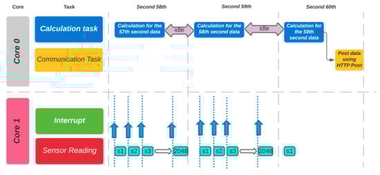 For this meter, the functions are divided into three major tasks: measurement, processing, and data relaying. The measurement task is pinned to core 1 of the CPU and is used to poll the sensors regularly and update the array containing voltage and current samples. This core samples the readings in the current instant by utilizing hardware timer interrupts. This task is very time-critical, meaning that the polling should be symmetrical and synchronous; otherwise, it may compromise the overall meter functionality. The polling task is depicted with s1, s2, s3, etc., as shown in Figure 4. Since the sampling frequency is 2048 Hz, the readings are taken at an equidistant sampling interval of 1/2048 s. With the selected sampling rate, the meter can measure the harmonics up to 20th order in both voltage and current. The second task of processing is pinned to core 0 of the CPU, processes the voltage and current readings captured in the previous second, and posts the data to the server every minute. This task has a deadline of 1 s, indicating that the readings of the previous second should be processed entirely, and the processor should be idle before the new readings arrive. The timeline of all the tasks and their respective cores are shown in Figure 4. The final task of data relaying is also pinned to core 0, and this task is executed every 60 s. This task relays both active and reactive power and energy, DPF, distortion VA of the grid and consumer, and the penalties and incentives for the PQ profiles. All the tasks run parallelly in real time, as shown in the timeline, and all the hardware resources and programming variables are shared within the two cores simultaneously.